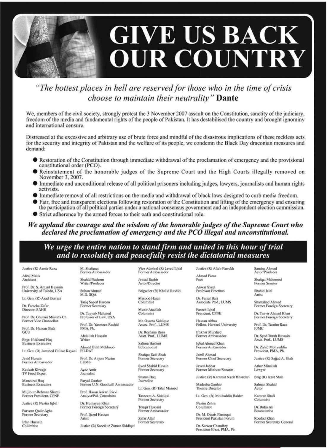 We, members of the civil society, strongly protest the 3 November 2007 assault on the Constitution, sanctity of the Judiciary, freedom of the media and fundamental rights of the people of Pakistan. It has destabilised the country and brought ignominy and international censure.